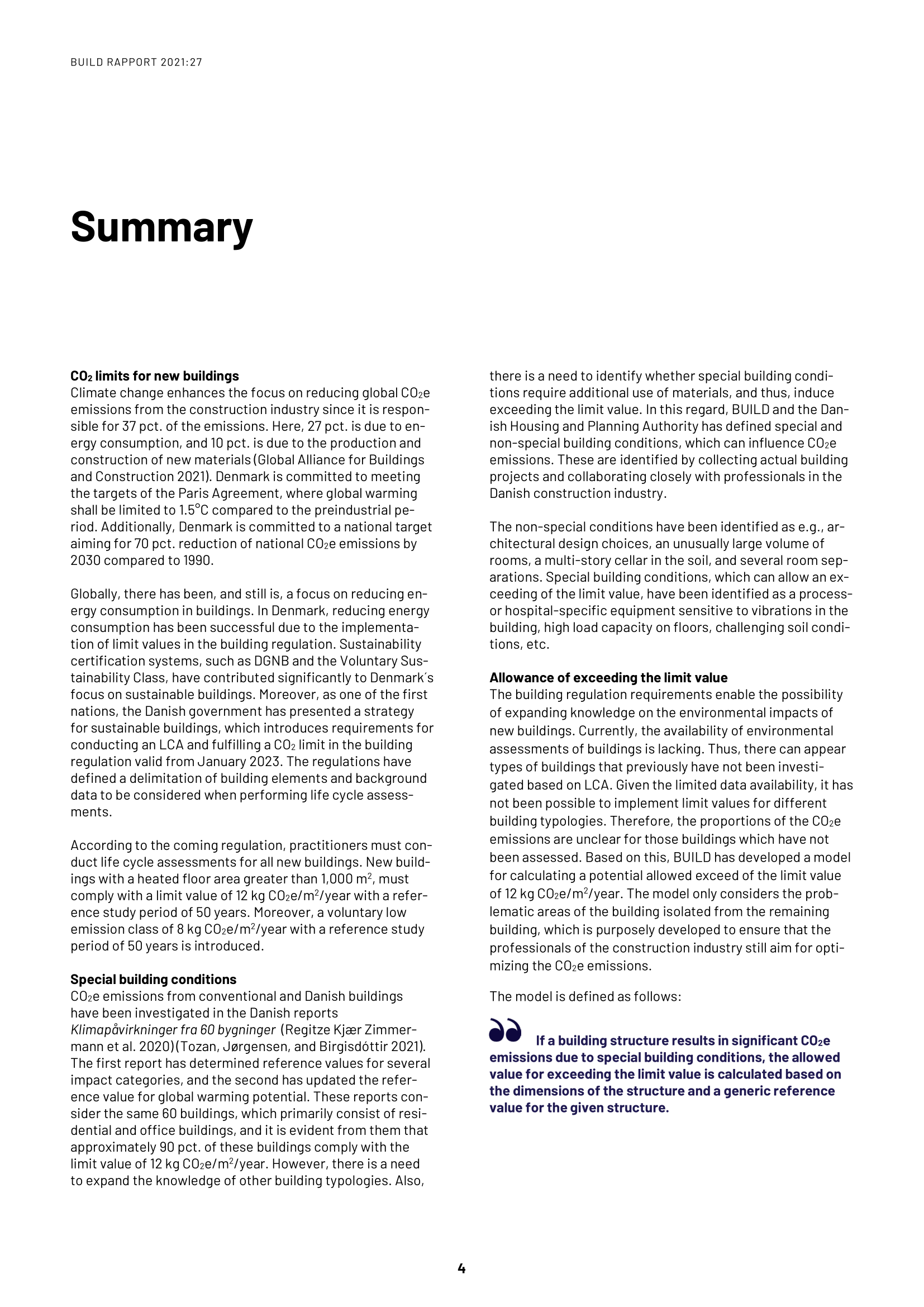Rapporten undersøger, hvilke særlige bygningsforudsætninger der kan medføre en overskridelse af CO2-grænseværdien, og i hvilke tilfælde overskridelsen kan tillades. Derudover udarbejdes en beregningsmodel, som kan fastsætte en værdi for den tilladte overskridelse.